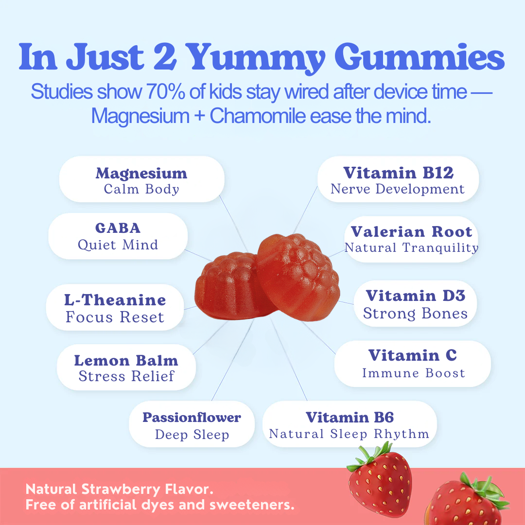 Our Bedtime Essentials include a blend of vitamins and minerals known to support a variety of nighttime functions. For example, L-theanine is an amino acid known to support calm and relaxation while b6 is a key vitamin known to support brain restoration in kids. As with our other products, as experts learn more about what exactly takes place during relaxation and wind down, our formulations will always take the latest science into account.
