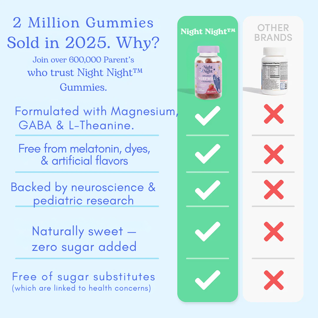 Added sugar can impact sleep, gummy additives can contribute to nighttime cavities, and there are increasing questions and concerns around potential health issues associated with melatonin and kids. Instead we focus on seven core essentials each individually selected for unique nighttime benefits.